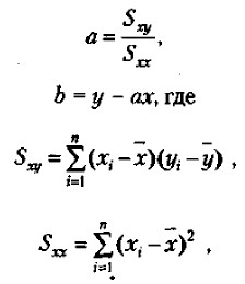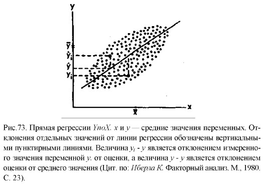 Воспользуемся для графического представления взаимосвязанных значений двух переменных х и у точками на графике (рис. 73). Поставим перед собой задачу: заменить точки на графике линией прямой регрессии, наилучшим образом представляющей взаимосвязь, существующую между данными переменными. Иными словами, задача заключается в том, чтобы через скопление точек, имеющихся на этом графике, провести прямую линию, пользуясь которой по значению одной из переменных, х или у, можно приблизительно судить о значении другой переменной. Для того чтобы решить эту задачу, необходимо правильно найти коэффициенты а и b в уравнении искомой прямой: у = ах + b. Это уравнение представляет прямую на графике и называется уравнением прямой регрессии. Формулы для подсчета коэффициентов а и b являются следующими:
