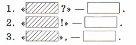 247. К словам автора допишите прямую речь. • Составьте схемы второго и четвёртого предложений. 1. Отец серьёзно спросил: — —? 2. Мальчик воскликнул: — —! 3. Экскурсовод сообщил: — —. 4. — —, — возразил Александр. 5. — —? — удивилась девочка. 6. Учитель физкультуры скомандовал: — —! 248. Поменяйте местами слова автора и прямую речь. Измените, где это необходимо, порядок слов в словах автора. Подчеркните глаголы, вводящие прямую речь. • Укажите обращения. 1. Мы попросили лесника: «Проводи нас, дедушка».4 2. Он пригласил: «Ступайте, ребята, за мной!» 3. «Мы готовы, Иван Ильич», — ответили ребята. 4. «Ешьте, ребята, яблоки», — предложил нам лесник. 5. Дети поблагодарили: «Спасибо, дедушка2, большое». 6. «Возьмите яблоки с собой в дорогу2»,—сказал лесник. 7. «Счастливого пути, приходите ещё»,—неслось нам вслед.