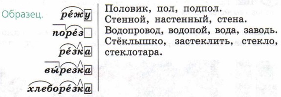 (А. К. Толстой) 157. Сгруппируйте слова по признаку: а) однокоренные слова; б) формы одного и того же слова. Какие существительные с суффиксами обозначают людей, а какие - предметы? Меб..ль, меб..льный, меб..ли, меб..лыцик; подмету, метёт, мести; п..ркет, п..ркетный, п..ркетного; шкаф, шкафчик, шкафчика; нат..рает, нат..рал, натирка; окно, подоконник, окна; уборка, уб..рала, уб..рает, уборщица. 158. Расположите столбиком однокоренные слова. Обозначьте в них значимые части слов, поставьте ударение.