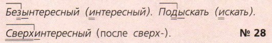 Образец рассуждения. Раз..скать - в этом слове есть приставка на согласную, однокоренное слово без приставки - искать начинается с буквы и, следовательно, после приставки раз- надо писать букву ы. 197. Спишите, обозначая условия выбора изучаемой орфограммы (см. образец в правиле). • Составьте предложение с выделенным словом. Подытожить, сверхизысканный, безымянный, розыск. 198. Запишите однокоренные слова с данными приставками, объясните графически орфограмму. • Какое из записанных слов отрицательно характеризует человека?