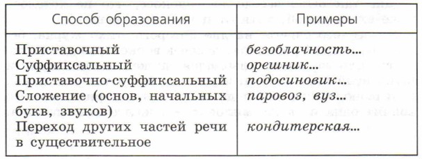 308. Диктант из слов с непроверяемыми орфограммами, правописание которых изучалось в теме «Имя существительное». 309. На основе материалов § 44, 45, 47-50 составьте сложный план сообщения об имени существительном как части речи; расскажите о нём по плану. • К какому стилю речи относится ваше сообщение? 310. Заполните 3-4 примерами таблицу «Способы образования имён существительных».