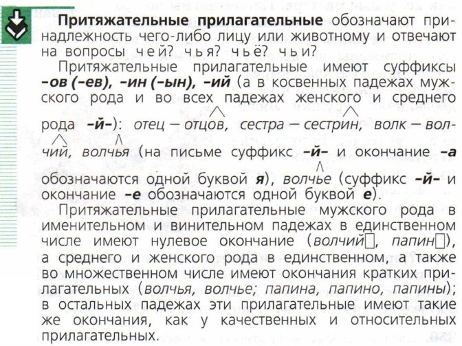 Произнесите слова пастушья, овечья. Какие звуки вы слышите на месте выделенных букв? Обозначает ли в них мягкий знак мягкость согласного или является разделительным? Какая это орфограмма? 349. Обозначьте условия выбора разделительных ъ и ь. Подчеркните притяжательные прилагательные. Вер6люж(?)я колюч(?)ка, пахн..т сырост(?)ю, под(?)езд к павил(?)ону, молоч(?)ный кисель, бул(?)он из шампин(?)онов, пастуш(?)я сумка, маш..т крыл(?)ями, с(?)езжать с круч(?), вет(?)ви ел.., выл(?)ю из кастрюл.., двух(?)ярусный мост, нян(?)чить внуч(?)ку, волч(?)я шкура, пис(?)мо сестрич(?)ке, колос(?)я яч(?)меня, об(?)ят огнём, об(?)яснить смысл п(?)есы, бел(?)ё на верёвк.., об(?)ездной путь, сем(?)я шахтёра, лис(?)ю нору. 350. Спишите, расставляя пропущенные знаки препинания. Над притяжательными прилагательными напишите пр. Укажите их род и падеж. Обозначьте условия выбора разделительного ь. 1. Лисичка сидит да пр..говаривает Мёрзни мёрзни волч.. хвост. 2. Подивился старик лис.. хитрости. 3. Кто там бежит? спрашивает лисица, услышав собач.. лай. 4. Поселилась лиса в заяч.. избёнке а зайчика3 выгнала. 5. Содрал волк баран.. шкуру и ждёт Котофея Ивановича. (Из русских сказок)