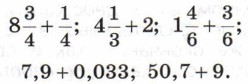 418. Прочитайте арифметические примеры, правильно выговаривая окончания. Запишите примеры словами. Образец. К восьми целым двум пятым прибавить четыре пятых.