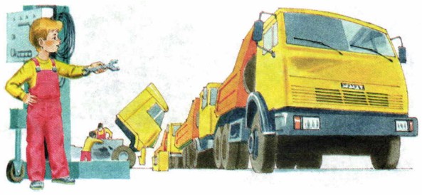 Ходили мы на экскурсию на автозавод и там видели, как разными болтами и гайками на главном конвейере свинчивают машины. Бегут по конвейеру колёса, крылья, моторы, а в конце цеха новенькие самосвалы с конвейера сходят.5 Ходим мы по цеху, смотрим. Оглядываемся назад: Вити Харитонова нет.