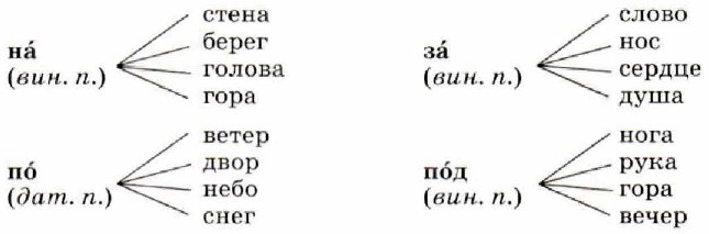Имя существительное Произношение имён существительных (окончание)Упр. 166 1. Перечитайте правило в рубрике «Возьмите на заметку!». Употребите данные предлоги с существительными в указанном падеже, поставьте ударение. Произнесите эти словоформы правильно — с ударением на предлоге.