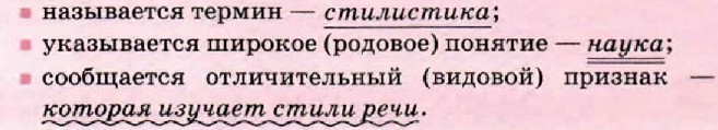 Упр. 180 Спишите определения понятий. Подчеркните термин одной прямой чертой, родовое понятие — двумя, отличительный признак — волнистой линией. 1) Прямая речь — это (что?) речь какого-либо лица, (какая?) передаваемая без изменений. 2) Экватор — это (что?) географическая параллель, (какая?) которая находится на одинаковом расстоянии от обоих полюсов. 3) Барометр — (что?) прибор (какой?) для измерения атмосферного давления. Упр. 181. Учимся говорить на лингвистическую тему Постройте определения следующих лингвистических понятий: фонетика, подлежащее, суффикс. Подберите к каждому из них родовое понятие; для выражения отличительного признака используйте предложение со словом который; подчеркните, как указано в упр. 180, части определения понятий.