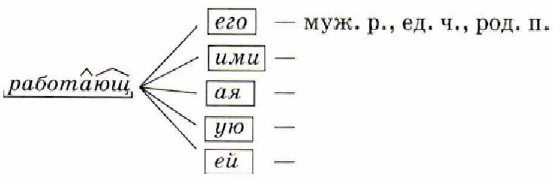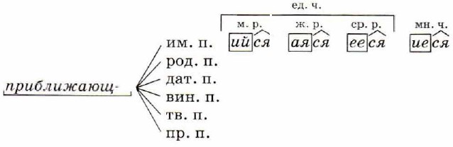 2. Запишите данные в схеме формы причастият употребив их вместе с определяемыми существительными. 3. От причастия работающий образуйте и запишите следующие грамматические формы; а)ед. ч., муж. р., тв. п.; б) ед. ч., ср. р., пр, п. Объясните написание окончаний. Упр. 402 Просклоняйте причастие приближающийся и запишите в схему окончания соответствующих падежей. Выполняя эту работу, чётко проговаривайте каждую морфему слова. Обратите внимание: глагольный суффикс -ся сохраняется во всех формах причастия и стоит после окончания.