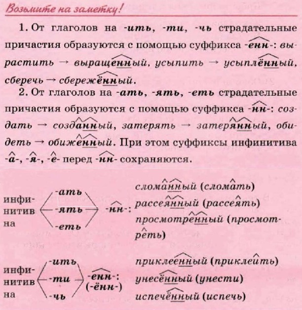 1. Вспомните, при каких условиях в страдательных причастиях прошедшего времени пишется суффикс -енн-, а при каких — -нн-. Чтобы привести примеры, обратитесь к упр. 418. 2. Образуйте и запишите причастия с суффиксами -енн- или -нн- сначала от глаголов на -ить, -ти, -чь, а потом от остальных глаголов. Чем вызвано такое деление глаголов на две группы? Обозначьте в причастиях все суффиксы.