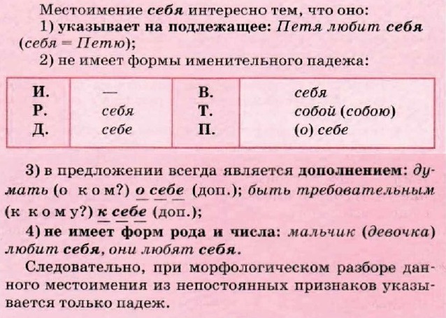 Упр. 680 Составьте словосочетания или предложения со всеми падежными формами возвратного местоимения. Два местоимения разберите как часть речи. Упр. 681 Придумайте и запишите предложения с устойчивыми (фразеологическими) оборотами речи, включающими возвратные местоимения. Если необходимо, можете изменить форму фразеологических выражений. Сдержать себя, вбить себе в голову, набивать себе цену, быть себе на уме, не по себе, предоставить самому себе, превозмогать себя, прийти в себя, выходить из себя, выводить из себя, сдерживать себя, переламывать себя. Упр. 682 1. Спишите отрывок из письма М. Горького сыну, восстанавливая пропущенные знаки препинания и верное написание слов. Ты уехал а цветы посаж..(н, нн)ые тобою остались и растут. Я смотрю на них и мне приятно думать, что мой сынишка оставил после себя на Капри нечто хорошее — цветы. Вот если бы ты всегда и везде, всю свою жизнь оставлял для людей только хорошее — цветы, мысли, славные воспоминания о себе, — легка и приятна была бы твоя жизнь. Тогда ты чувствовал бы себя всем людям нужным и это чувство сделало бы тебя богатым душой. Знай, что всегда приятнее отдать, чем взять. 2. Выпишите местоимения, распределяя их по разрядам (см. § 56). Местоимения каких разрядов есть в данном тексте? 3. Подчеркните возвратное местоимение как член предложения, укажите падеж. 4. Проведите морфологический разбор одного возвратного и одного личного местоимения.