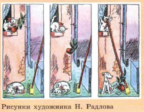 3. Выпишите слова с приставками и объясните их правописание. Упр. 722 1. Рассмотрите на вклейке (с. 16) рисунки художника Н. Радлова о кошке и собаке. Озаглавьте рассказ, который можно составить по данным рисункам. Хорошо, чтобы заглавие отвечало на вопрос: кого наказала коварная кошка? Рассказ может содержать такие части: