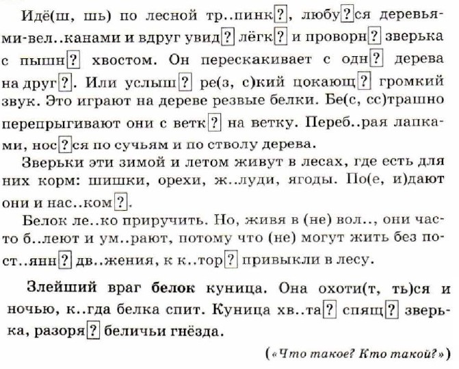 3. Объясните, как вы понимаете смысл последнего предложения. 4. Выполните словообразовательный разбор выделенного слова. Упр. 60 1. Прочитайте и озаглавьте текст. Сравните его с текстом упр. 58 и сделайте выводы. В тундре — весна. Звенят большие и малые руч(?)и. Со стоном взлам..ваю(т, ть)ся речушки в горах. <...> Вода всюду. Ступ..шь ногой в мох — и мох сочи(т, ть)ся. Трон..шь мшистую кочку — и кочка сочи(т, ть)ся. Стан..шь робко ногой на ледок — из-под ледка брызн..т вода, звонкая, весенняя. Вся тундра сейчас — сплошное болото. Оно ож..влённо всхлип..ва..т под сапогами, мягкое, податливое, покрытое ж..лтой прошлогодн..й травой и нежным весенн..м мхом, похож..м на ц..плячий пух. Весна вход..т в тундру робко и неуверенно. Ост..навл..ва..тся. Огляд..ва..тся. Испуганно зам..ра..т под неожиданным нордом и всё-таки идёт, идёт... (Б. Горбатов) 2. Спишите, вставляя пропущенные буквы. 3. Выделите морфемы, в которых пропущены буквы, объясните правописание. 4. Поясните, как вы определяли правописание окончаний глаголов и прилагательных, а также суффиксов глаголов. 5. Подчеркните грамматическую основу выделенного предложения, объясните постановку тире. Выполните синтаксический разбор этого предложения. Упр. 61 1. Озаглавьте текст и перепишите его.