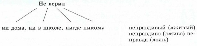 Образец. (ни)чему; (ни)одному человеку; (ни)когда; (ни)при каких обстоятельствах; (не)слушал (ни)кого; (не)верил (ни)одной строчке; (не)доверял (ни)разу; (не)мог поверить; (не)хотел убеждаться в правоте и т. д. 434. Допишите данные ниже словосочетания и предложения, употребляя существительные с частицей ни. Подчеркните слова с ни, которые усиливают отрицание. 1. Не изменил в рукописи __ __. 2. Нет свободного времени __ __. 3. Тишина не нарушалась __ __. 4. Не верил __ __. 5. Не выходил из дома __ __. 6. Не видно __ __. 7. Не слышно __ __. 435. Знаете ли вы данные ниже устойчивые сочетания? Продолжите их, слова с не и ни подчеркните. Объясните, что обозначает какое-либо из этих устойчивых сочетаний, когда и как оно употребляется. 1. Комар носу __ __. 2. Палец в рот __ __. 3. Камня на камне __ __. 4. Палец о палец __ __. 5. Ни рыба __ __. 6. Ни жив __ __. 7. Ни свет __ __. 8. Ни дать __ __. 9. Ни два __ __. 10. Ни то __ __. 11. Какой бы то __ __. 12. Во что бы то __ __. 13. Нельзя ни проехать, __ __. 436. Диктант. Обозначьте главные слова в словосочетаниях. Производные предлоги заключите в прямоугольник. Г..товить стенг..зету, (в)течени.. (не)скольких дней, продумать к..рикатуру, отредактировать с..тирическую з..метку, с весёлым юм..ром, ра(с, сс)казать о заседани.. редколлегии, закончить(бы) (во)время, н..когда3 н..кого3 сатира (не)подводить, объявить конкурс на лучшую статью, рисунок, фотографию.