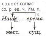 Главное слово — время. Время (к а к о е?) наше. Это зависимое слово. Главное слово выражено существительным, зависимое — местоимением. Связь между словами выражена с помощью окончания зависимого слова [-е]. Словосочетание именное. Вид подчинительной связи — согласование.