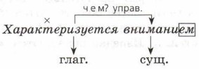Главное слово — характеризуется. Характеризуется (ч е м?) вниманием. Это зависимое слово. Главное слово выражено глаголом, зависимое — существительным. Связь между словами выражена с помощью окончания зависимого слова [-ем]. Словосочетание глагольное. Вид подчинительной связи — управление.