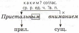 Главное слово — вниманием. Вниманием (к а к и м?) пристальным. Это зависимое слово. Главное слово выражено существительным, зависимое — прилагательным. Связь между словами выражена с помощью окончания зависимого слова [-ым]. Словосочетание именное. Вид подчинительной связи — согласование.