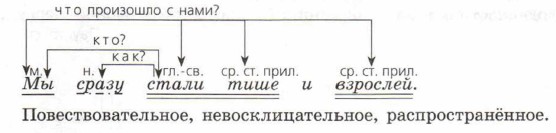 Образец разбора Мы сразу стали тише и взрослей... (Н. Рубцов) Устный разбор Это предложение повествовательное, невосклицательное. Грамматическая основа предложения — мы (подлежащее), стали тише и взрослей (однородные сказуемые). Подлежащее — мы, выражено местоимением. Сказуемые — стали тише и взрослей, составные именные, выражены глаголом-связкой стали и именными частями тише и взрослей, прилагательными в сравнительной степени. Сразу — обстоятельство образа действия, выражено наречием. В предложении есть второстепенный член, поэтому оно распространённое. Стали тише и взрослей (к а к?) сразу — обстоятельство образа действия. Письменный разбор