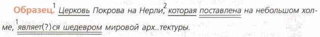 1. Там где река Нерль впадает в Клязьму с 1165 года возвышает(?)ся этот белокаме(н, нн)ый2 храм. 2. И во время весеннего разлива когда вода подступала2 к самым стенам церкви одиноко высился осл..пительно св..ркающий бел..зной лёгкий одноглавый храм. 3. Этот уд..вительно г..рмоничный белокаме(н, нн)ый храм который сливает(?)ся с окружающ..м пейзаж..м называют поэмой, запеч..тлё(н, нн)ой в камне. 4. Пр..дание рассказывает что князь Андрей Боголюбский построил храм Покрова́ на Нерли после гибели в военном походе любимого сына Изяслава. 5. Светлый и лёгкий, храм Покрова́ на Нерли — это воплощё(н, нн)ая победа духа над материей. 6. Зодчие чтобы1 преодолеть тяжесть камня удачно выбрали пропорции, формы и детали. 7. Практически невозможно заметить что стены церкви слегка наклоне(н, нн)ы внутрь и этот еле заметный зрителю наклон ув..личивает выс..ту здания. 18. Составьте схемы предложений из предыдущего упражнения по образцу. В нём показано, что придаточное предложение расположено внутри главного, поэтому прямоугольник, обозначающий главное предложение, изображается с разрывом. Обратите внимание на постановку знаков препинания в схеме. Эта схема отражает строение предложения, данного в образце упр. 17.