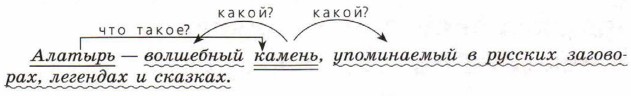 Обособленные члены предложения § 53. Синтаксический разбор предложения с обособленными членамиПорядок разбора Порядок синтаксического разбора тот же, что и в § 28, 38, 45. В пункт 4 данного параграфа, по сравнению с пунктом 4 § 45, добавляется, что предложение осложнено обособленными членами. В пункте 5 указывается, каким членом предложения является весь оборот. Образец разбора Алатырь — волшебный камень, упоминаемый в русских заговорах, легендах и сказках. Устный разбор Это предложение повествовательное, невосклицательное. Грамматическая основа — алатырь (подлежащее), камень (сказуемое); значит, оно простое, двусоставное. В предложении есть второстепенные члены: камень (к а к о й?) — волшебный, упоминаемый в русских заговорах, легендах и сказках. Поэтому оно распространённое. Предложение осложнено распространённым согласованным определением, которое относится к существительному камень. Подлежащее — алатырь, выражено существительным. Сказуемое — камень, составное именное сказуемое, связка нулевая, именная часть выражена существительным в именительном падеже. Волшебный — согласованное определение, выражено прилагательным. Упоминаемый в русских заговорах, легендах и сказках — обособленное согласованное распространённое определение, выражено причастным оборотом. Письменный разбор