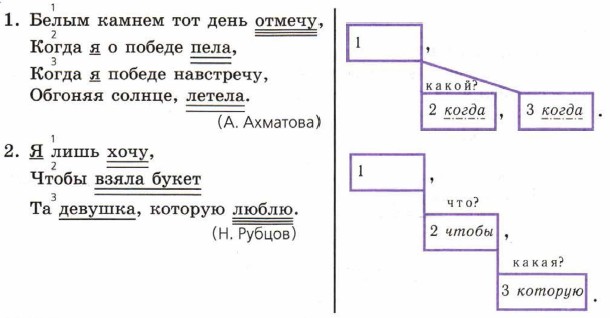 Прочитайте предложения и соотнесите их со схемами, данными справа. Сколько придаточных частей в каждом из сложноподчинённых предложений? К чему присоединяются придаточные части в первом сложном предложении? во втором? В чём различие в структуре этих сложноподчинённых предложений?