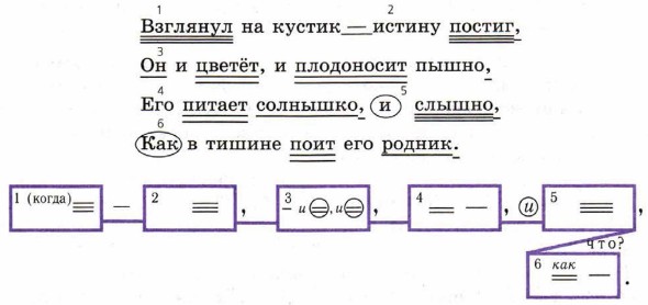 Устный разбор Предложение повествовательное, невосклицательное. Состоит из шести простых предложений в составе сложного. В первом предложении грамматическая основа взглянул; во втором — постиг; в третьем — он и цветёт, и плодоносит; в четвёртом — питает солнышко; в пятом — слышно; в шестом — поит родник. Это многочленное сложное предложение с различными видами связи. Связь между первым и вторым предложениями бессоюзная, средство связи — интонация. Между первым и вторым предложениями ставится знак разделения — тире. Третье и четвёртое предложения присоединены интонацией перечисления. Между вторым и третьим, третьим и четвёртым предложениями ставятся разделительные запятые. Пятое предложение объединено с предшествующими союзной связью с помощью союза и, перед которым ставится разделительная запятая. Шестое предложение присоединено подчинительным союзом как; это предложение выделяется запятыми. Письменный разбор