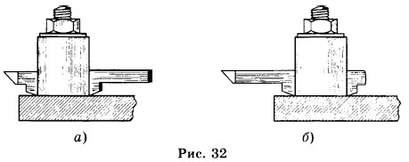 272. Что делается с волокнами нижней грани бруска (рис. 31) при изгибе? 273. Когда резец больше сгибается под давлением стружки: если он выпущен из суппорта на большую или на меньшую длину (рис. 32, а-б)?