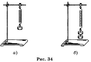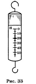 305. Как измерить силу, с которой игрушечный паровозик тянет по полу вагончики? 306. На рисунке 33 изображен прибор для измерения силы — динамометр. Определите цену деления его шкалы. 307. К пружине подвесили сначала грузик массой 204 г (рис. 34, а), затем его заменили на грузик массой 306 г (рис. 34, б). С какой силой растягивается пружина в каждом случае?