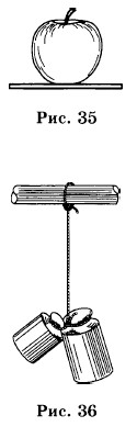 311. На столе лежит яблоко (рис. 35) весом 0,6 Н. В выбранном вами масштабе изобразите графически силу тяжести яблока и его вес. 312. Две гири в 50 г и 10 г висят на одной веревочке (рис. 36). Определите силу натяжения веревочки. 313. Человек массой 70 кг держит груз массой 30 кг. С какой силой давит человек на землю? 314. Рабочий массой 65 кг пытается поднять с земли груз массой 40 кг, прилагая силу в 250 Н. С какой силой рабочий давит на землю? С какой силой давит на землю груз? 315. Вычислите суммарную силу тяги, действующую на поезд, который везут два тепловоза. Один развивает силу тяги 80 кН, другой 85 кН. 316. Силы 2 Н и 18 Н, действующие на тело, направлены по одной прямой в одну сторону. Найдите их равнодействующую и изобразите силы графически. 317. Подъемный кран поднимает равномерно вертикально вверх груз весом 8 кН. Изобразите силы, действующие на груз, векторами в масштабе: 1 см соответствует 2 кН. 318. На горизонтальном участке пути сила тяги паровоза 30 кН, сила сопротивления движению 10 кН. Изобразите эти силы векторами в масштабе: 1 см соответствует 10 кН. Будет ли поезд двигаться равномерно? Почему? 319. С помощью стального троса буксир тянет баржу (от буксира к барже протянут стальной трос) в спокойной воде. Баржа движется равномерно. Укажите, какие силы действуют на баржу. 320. На рисунке 37 дан график скорости движения поезда. Что можно сказать о соотношении силы тяги и силы сопротивления движению на различных участках пути поезда? 321. На рисунке 38 показан график пути поезда. Перечертите его в тетрадь и выделите на графике участки, на которых действующие на поезд силы уравновешены.