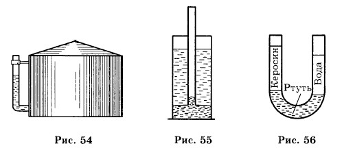 432. На рисунке 53 изображены два химических сосуда, присоединенные друг к другу стеклянной трубкой с краном. Оба сосуда наполнили водой до одной и той же высоты. Одинаково ли давление на дно каждого сосуда? При открытом кране будет ли вода переливаться из одного сосуда в другой? 433. Два сосуда на рисунке 53 наполнены до одинакового уровня: один — водой, другой — керосином. Одинаково ли давление на дно? Будет ли переливаться жидкость из одного сосуда в другой, если открыть кран? Останутся ли одинаковыми уровни жидкости, если открыть кран? 434. Действует ли закон сообщающихся сосудов в условиях невесомости? в условиях слабой силы тяжести, например на Луне? 435. В мерной трубе нефтяного бака (рис. 54) нефть стоит на высоте 8 м от дна бака. Каково давление столба нефти на дно бака? 436. На дно мензурки налит слой ртути, в этот слой опущен конец открытой стеклянной трубки (рис. 55). Поверх ртути налили в мензурку воды до высоты 27,2 см. До какой высоты поднимется ртуть в стеклянной трубке? 437. В U-образную трубку налиты ртуть, вода и керосин (рис. 56). Высота столба воды равна 20 см, а уровень ртути в обоих сосудах одинаков. Какова высота слоя керосина?