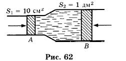 460. На рисунке 62 изображена горизонтально расположенная, наполненная водой труба с двумя поршнями А и В. В своей широкой части труба имеет площадь поперечного сечения S2 = 1 дм2, а в узкой — S1 = 10 см2. На поршень В действует сила 10 кН. Какой силой надо действовать на поршень А, чтобы уравновесить силу, действующую на поршень В?
