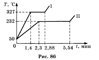 Изменение агрегатных состояний вещества Агрегатные состояния вещества. Плавление и отвердевание кристаллических тел. График плавления и отвердевания кристаллических тел. Удельная теплота плавления834. В каком состоянии находится спирт при температуре -120 °С? 835. В каком состоянии находится железо при температуре 1500 °С? 836. Кусок меди массой 4 кг расплавился. На сколько увеличилась его внутренняя энергия? 837. Сколько энергии понадобится для расплавления свинца массой 10 кг, взятого при температуре плавления? 838. Сколько энергии будет затрачено для расплавления свинца массой 10 кг, взятого при начальной температуре 27 °С? 839. Какое количество теплоты затрачено на расплавление 1 т железа, взятого при температуре 10 °С? 840. Свинец объемом 10 см3, взятый при начальной температуре 20 °С, полностью расплавился. Какое количество теплоты было при этом затрачено? 841. На плавление какого металла, взятого при температуре 20 °С, нужно большее количество энергии: на 1 г меди или 1 г серебра? На сколько больше? 842. В каком случае требуется большее количество энергии и на сколько: на плавление 1000 кг железа или 1000 кг алюминия, если и железо, и алюминий взяты при начальной температуре 10 °С? 843. На рисунке 86 изображены графики зависимости температуры от времени для слитка свинца (I) и слитка олова (II) одинаковой массы. Количество теплоты, получаемое каждым телом в единицу времени, одинаково. Определите по графику: 1) У какого слитка температура плавления выше?