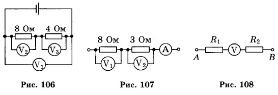 1079. Вольтметр, подключенный к источнику тока (рис. 109), показывает напряжение 5 В. Какова сила тока в цепи?