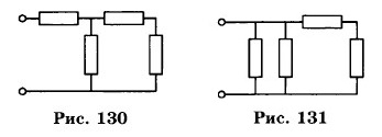1128. Одинаковые сопротивления, каждое из которых равно 4 Ом, соединены как показано на рисунке 130. Каково общее сопротивление и сила тока, если напряжение на клеммах равно 12 В? 1129. Сопротивления по 4 Ом каждое соединены как показано на рисунке 131. Напряжение между клеммами равно 12 В. Каково общее сопротивление? Какова сила тока в цепи?