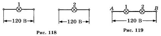 1116. Между двумя точками А и В (рис. 120) поддерживается напряжение 120 В. а) Как между этими точками включить две лампочки, чтобы они горели так же ярко, как каждая в отдельности?