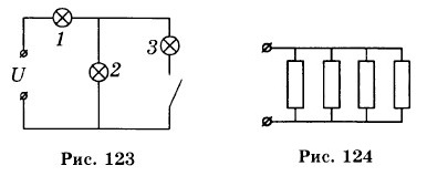 1121. На рисунке 123 приведена схема электрической цепи с тремя одинаковыми лампами. Изменится ли накал ламп 1 и 2 после замыкания ключа, если напряжение в обоих случаях одинаково? Если да, то как именно? 1122. Одинаковые сопротивления, каждое из которых равно 4 Ом, соединены параллельно (рис. 124). Определите общее сопротивление и силу тока, если напряжение на клеммах 12 В.