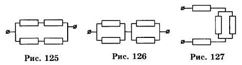 1123. На рисунке 125 изображено соединение четырех одинаковых сопротивлений, каждое из которых равно 4 Ом. Напряжение на клеммах равно 12 В. Определите общее сопротивление и силу тока. 1124. Четыре одинаковых сопротивления, каждое из которых равно 4 Ом, соединены как показано на рисунке 126. Каково общее сопротивление и сила тока, если напряжение на клеммах равно 12 В? 1125. Сопротивления по 4 Ом каждое включены в цепь по схеме на рисунке 127. Напряжение между клеммами равно 12 В. Каково общее сопротивление? Какова сила тока в цепи?