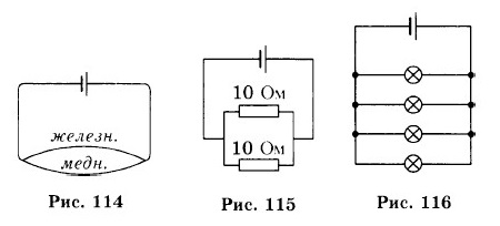 1090. На рисунке 114 изображены две параллельно соединенные проволоки одинаковой длины и одинакового сечения, но из разного материала: железная и медная. По какой из них пойдет ток большей силы? Почему?