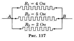 1103. Между точками А и В включены три сопротивления (рис. 117). Определите общее сопротивление разветвленной части цепи, напряжение на концах разветвленной части цепи, ток в каждом из проводников, если ток в неразветвленной части цепи 5 А.