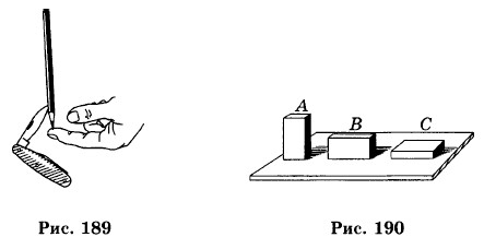 1500. В каком положении равновесия находится карандаш на рисунке 189? Почему? 1501. Какое положение кирпича, изображенного на рисунке 190, самое устойчивое? Наименее устойчивое? Почему?