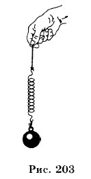 1549. Как будет изменяться деформация пружины, если ее вместе с подвешенным грузом (рис. 203) перемещать с ускорением вертикально вверх? вертикально вниз? Объясните. 1550. К гирьке весом 5 Н привязана нить, которая может выдержать натяжение 5,2 Н. Выдержит ли нить, если, потянув ее за конец вертикально вверх, попытаться заставить гирьку двигаться с ускорением 60 см/с2? 1551. На пружинных весах подвешен груз в 140 Н. Какой вес покажут они, если двигать их вертикально вверх с ускорением в 28 см/с2? Если двигать вниз с тем же ускорением? Если двигать вверх и вниз с ускорением 490 см/с2? Какой вес покажут весы, если они вместе с подвешенным грузом будут свободно падать? 1552. Подъемный кран поднимает груз 9,8 кН, лежащий на земле, с ускорением 1 м/с2, направленным вертикально вверх. Определить силу, действующую на стальной канат крана в момент отрыва груза от земли. 1553. По наклонной плоскости высотой 3 м и длиной 5 м скользит брусок весом 8 Н. Коэффициент трения 0,2. Определите ускорение движения бруска. 1554. На закрепленном динамометре подвешен легкий блок, весом которого можно пренебречь. Через блок перекинута нить, к концам которой подвешены два груза по 2,4 Н каждый. На один из них кладут перегрузок 0,1 Н. Каковы показания динамометра во время движения грузов?