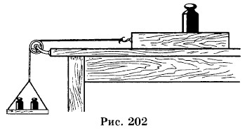 Верны ли эти положения? 1537. Покажите, что первый закон Ньютона находится в полном соответствии со вторым законом Ньютона. 1538. Покажите, что пути, проходимые в одно и то же время двумя телами, пропорциональны действующим силам, если массы тел равны, и обратно пропорциональны массам, если действующие на них силы равны. 1539. Какую силу нужно приложить к телу, масса которого 1 кг, чтобы оно стало двигаться с ускорением 5 см/с2? 1540. Под действием силы 5 • 10-3 Н тело движется с ускорением 0,2 м/с2. Определите массу тела. 1541. С каким ускорением будет двигаться тело, масса которого 0,1 кг, под действием силы 2 • 10-2 Н? 1542. Тело, масса которого 100 г, начиная двигаться равноускоренно, в течение 4 с проходит 80 см. Определите величину силы, действующей на тело, если сила трения равна 2 • 10-2 Н. Какая потребуется сила, чтобы тело, пройдя указанное расстояние, продолжало двигаться дальше равномерно? 1543. Через блок перекинута нить, на которой подвешены два груза по 2,4 Н каждый. На один из грузов кладут перегрузок в 0,1 Н. Определите расстояние, пройденное этим грузом в течение 3 с. 1544. Тело, вес которого 0,49 Н, под действием силы начинает двигаться равноускоренно и, пройдя 50 см, приобретает скорость 0,72 км/ч. Определите силу, действующую на тело. 1545. Брусок (рис. 202) вместе с грузом весит 50 Н. Когда чашка А с грузами весит 20 Н, брусок движется по горизонтально установленной доске с ускорением 20 см/с2. Определите силу трения.