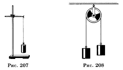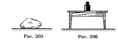 1556. Через два неподвижных блока перекинут шнур, к концам которого подвешены гири по 5 кг каждая (рис. 204). Шнур между блоками разрезали и присоединили к динамометру. Что покажет динамометр? 1557. О ветровое стекло едущей машины ударилась муха. Какие силы действуют на муху во время удара? Какие силы действуют на машину во время удара? Сравните силы, действующие на муху и на машину во время удара. 1558. Две фигуристки, стоя на коньках на льду, оттолкнулись друг от друга. Что произойдет с фигуристками? 1559. Космонавт в невесомости выпустил из рук массивный предмет (не толкая его). Что произошло с космонавтом? Что с ним произойдет, если он бросит этот предмет? 1560. Почему человек не может поднять себя за волосы? 1561. Сидя в санках на ровной местности, вам не удастся заставить сани двигаться, как бы сильно вы не тянули за веревку. Но если вы выйдете из саней и будете их толкать или тянуть за веревку с той же силой, сани поедут. Почему? 1562. Железная гайка притягивается к магниту. Притягивается ли магнит к гайке? Если магнит и гайку положить на отдельные пробки и пустить плавать в воде, что произойдет? Проверьте на опыте. 1563. В следующих примерах какие силы вы назовете действующими и какие противодействующими? а) На горизонтальной поверхности земли лежит камень (рис. 205).