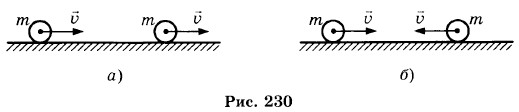 1681. Пушечное ядро массой 9 кг вылетает из ствола пушки со скоростью 800 м/с. Ствол пушки ядро проходит за 0,008 с. Найдите среднюю силу давления пороховых газов. 1682. Автобус массой 5 т, двигаясь по горизонтальной дороге, сбросил скорость от 108 км/ч до 36 км/ч за 10 с. Какова средняя сила торможения? 1683. Птица массой 2 кг оказалась на пути самолета, летевшего со скоростью 2200 км/ч. Длительность удара птицы о стекло кабины летчика равна 0,001 с. Площадь соприкосновения птицы со стеклом равна 1000 см2. Определите среднюю силу удара и среднее давление на стекло при ударе. 1684. Два одинаковых шарика массой 0,1 кг каждый катятся по столу поступательно и прямолинейно с одинаковыми скоростями, равными 6 м/с, вдоль одной прямой: а) один за другим (рис. 230, а);