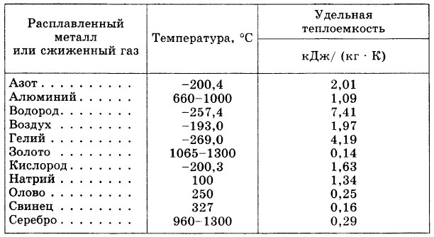 Пример. Сухой термометр показывает 22 °С, влажный -19 °С. Разность показаний термометров 3 °С. Значение относительной влажности (в процентах) находят на пересечении строки, начинающейся числом 22, и столбца, в головке которого стоит число 3, т.е. относительная влажность равна 76%. Удельная теплоемкость расплавленных металлов и сжиженных газов