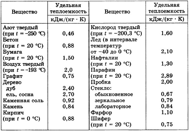 Удельная теплоемкость твердых веществ (t° от О °С до 100 °С)