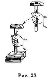 169. Почему, для того чтобы посадить молоток на ручку, ударяют концом ручки молотка о неподвижный предмет (рис. 23)? 170. Почему споткнувшийся человек падает по направлению движения? 171. Спрыгивая с некоторой высоты и становясь на землю, человек подгибает ноги в коленях. Почему? 172. Что труднее: сдвинуть вагон с места или уже сдвинутый вагон двигать равномерно? Почему? 173. Что будет со всадником, скачущим на лошади, если лошадь внезапно остановится? 174. Благодаря какому физическому явлению удается удалить пыль из ковра выколачиванием? встряхиванием?