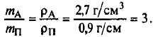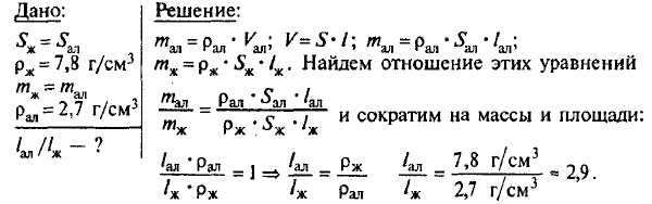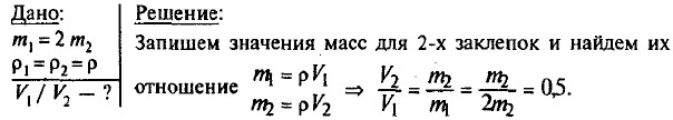 Объем первой заклепки в 2 раза больше объема второй. 230. По условию задачи объемы шаров равны. Выразим их массы m через плотность ρ и объем V: mА = ρА • V и mП = ρП • V Возьмем отношение 231. Так как объемы взвешиваемых жидкостей одинаковы, а массы различны, то большей плотностью обладает молоко (наибольшая масса), а наименьшей плотностью — масло (наименьшая масса). 232. Так как весы уравновешены, то масса грузов одинаковы, но объем правого груза меньше объема левого груза, следовательно его плотность больше. Плотность вещества, из которого сделан правый кубик, больше. 233. Так как массы растворов одинаковы, а объем серной кислоты меньше объема воды, то плотность серной кислоты больше плотности воды. 234. Массы грузов одинаковы. Плотность того груза больше, объем которого меньше. Из таблицы: ρол = 7,3 г/см3; ρсв= 11,3 г/см3. Следовательно, левый брусок свинцовый, правый — из олова. 235. Так как объемы тел одинаковы, а массы различны, следовательно тело, имеющее ббльшую массу, сделано из вещества, имеющего большую плотность. ρж = 7,8 г/см3; ρч = 7 г/см3. Масса левого бруска больше — он железный. 236. Например, платина (ρм = 21,46 г/см3) и магний (ρм = 1,76 г/см3). 237.