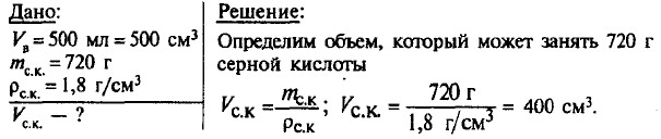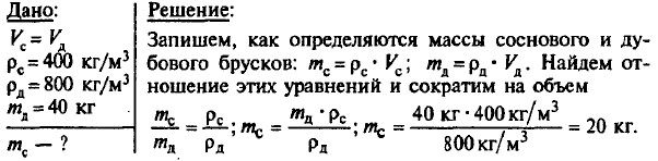 Объем, который могут занять 720 г серной кислоты, равен 400 см3, следовательно 720 г серной кислоты вместятся в бутылку объемом 500 см3. 239. Массы брусков одинаковы, плотность олова меньше плотности свинца, следовательно брусок из олова больше по объему и при погружении вытеснит бйльший объем воды. 240. При равных массах та деталь имеет больший объем, плотность вещества которой меньше. ρал < ρм, следовательно Vал > Vм. Уровень керосина станет выше при опускании алюминиевого бруска. 241.