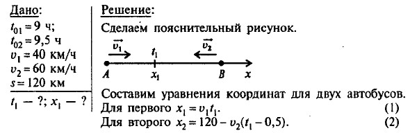 Второе тело находится в движении на 0,5 ч меньше первого, поэтому (t1 - 0,5) ч — это его время движения. Так как в месте встречи тела имеют одинаковые координаты и время встречи одинаковое, то, приравняв уравнения (1) и (2), найдем время движения автобусов до встречи и, подставив его в уравнение (1), найдем расстояние места встречи от точки А. υ1 • t1 = 120 - υ2 (t1 - 0,5); 40t1 = 120 - 60 (t1 - 0,5); 40t1 = 120 - 60t1 + 30; 100t1 = 150; t1 = 1,5 (ч); х1 =40 • 1,5 = 60 (км). Автобусы встретятся через 1,5 ч после выхода первого автобуса в 60 км от точки А. 143.
