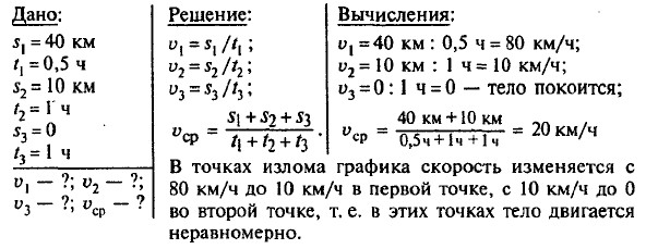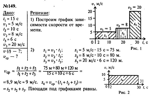 147. Тело 1 за равные промежутки времени проходит равные отрезки пути. Следовательно, оно движется равномерно. Тело 2 движется ускоренно, а тело 3 — замедленно. Нельзя утверждать, что тела движутся прямолинейно, так как мы не знаем зависимость вектора перемещения от времени. В случае 1, например, это может быть равномерное движение по окружности. 148. По графику выписываем данные и решаем задачу.