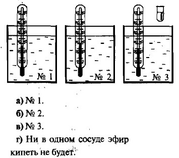 II. Изменение агрегатных состояний вещества Кипение (окончание)6. В какой из сосудов надо опустить пробирку, чтобы находщцийся в ней эфир закипел? (Предполагается, что температуры жидкостей в сосудах поддерживаются постоянными.)